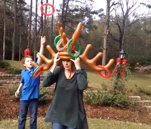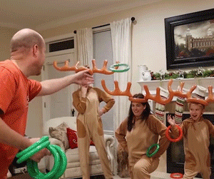 Werfen Sie die runden Ringe auf das große Rentiergeweih auf dem Kopf Ihres Freundes und tragen Sie abwechselnd das Geweih, um Ihre eigenen Spiele zu entwickeln.